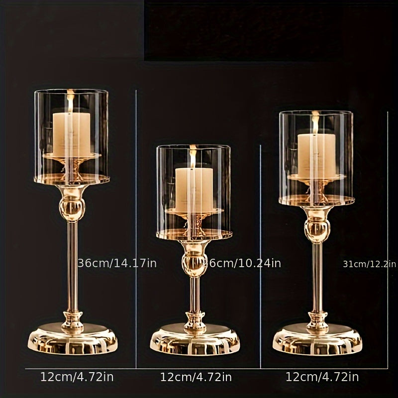 3pcs Set of Elegant Golden Metal Glass Candlesticks - Stainless Steel, Romantic Dinner and Home Decoration Table Design